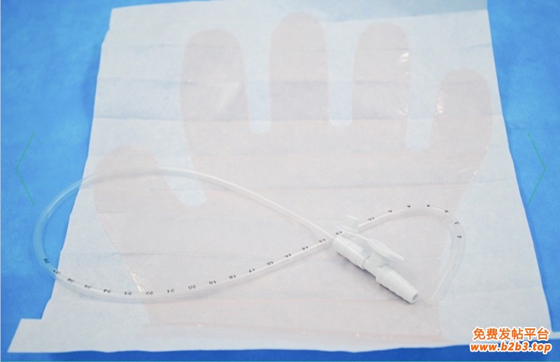 2、打开包装袋,取出吸痰包配件,按规定戴好无菌手套以及放置好其他配件,并检查吸痰管是否有否曲折、阻塞现象;