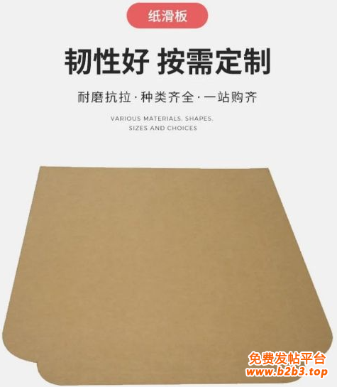 纸滑托盘又称纸滑托板,是由多层高克重牛皮纸复合而成,经特殊的干燥防潮工艺处理,具有良好的抗湿性和抗撕裂性,能更加有效更加合理地利用集装箱和运输车辆的空间。纸滑托盘运输和仓储可无需货盘。纸滑托盘是木托盘、塑料托盘和纸托盘的替代品,本产品免商检、免熏蒸、免消毒。质地轻,体积小,可重复循环使用,能在很大程度上为企业开源节流。优势